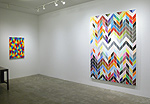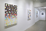 Paul Corio’s paintings are about the interplay of color blocks sequentially arranged to create illusions of light, atmosphere, space, and dimensional structure. He oscillates between the system-driven and the improvisational in his choice of hues, often combining both approaches in a single work. For Corio, the colors themselves are the true content of his paintings, and the geometric compositions of triangles, rectangles and parallelograms employed are more of a non-hierarchical ensemble of shapes. Ultimately, the spatial reading of his paintings is dependent on the placement of colors and the exploration of tonal values within each work. Color value, the relative lightness or darkness of a color, is often progressively varied by Corio as an organizing principle. Within each painting’s set of shapes, the color selection may shift between bright, dull or any hue of the spectrum, so long as it falls within a specific value range. The resulting space can be read as a strongly three-dimensional relief or as the effect of swelling light, both illusions especially pronounced in Corio’s depiction of repeated diamond forms. Many of Corio’s paintings have a rhythmic, pulsating Op-like intensity as the eye travels across the surface of the work. In other works, variations in contrast cause ribbon-like bands of color to recede or project as they meander across a white ground. In another approach to painting, Corio systematically embraces chance to establish his color placement. The numbers of the winning horses from a particular day at one of New York’s three racetracks dictate the rotation of multiple color wheels set in a grid. Dimensional diamond and boomerang shapes randomly emerge where like-colored sections of the “pinwheels” touch. Corio’s multifarious pursuits inform both the conception and construction of his paintings. His long-time interest in thoroughbred racing yields his randomized color wheel system and also provides the majority of the titles for his paintings. Other titles come from spy and detective fiction, samurai cinema, or jazz music. Corio recorded and toured as a drummer with a number of punk bands in the 1980s and 1990s; these days he plays jazz. | |||||||
