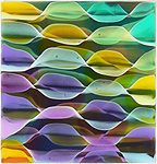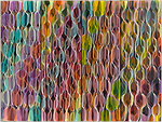 McQuillan has long explored the inherent properties of materials in simple, labor-intensive processes. Since 2013 she has focused on a systematic investigation of color relationships, inspired by the way technology mediates the perception of the modern viewer’s experience of color in the world. Working on wood panels, the artist applies clear acrylic polymer over a ground, then adds lines in white ink in a series of controlled gestures. The lines are subsequently suspended and manipulated to create an underlying net of complex folds and undulations. Translucent color is then added according to the artist’s ordered system, with patterns that are unique to each work. This process is repeated in multiple layers, creating paintings up to ¾ inches thick. While McQuillan works according to set rules, the final result is never entirely predictable, as optically unexpected mixtures of color occur as they are layered in the clear medium.   McQuillan’s exhibition title, Offset Drift, refers to a technical term describing the fluctuation of electric currents or other phenomena that deviate from an expected norm. The artist notes, “As much as I try to follow the rules I made at the outset, my process invariably runs off the rails, and goes off in an unexpected direction. That is not to say I just rely on accidents, because my process is a very directed and restrictive system. It’s just that all plans go awry and all systems go haywire.”   In her new paintings, there is a wider range of scales than in previous bodies of work, and larger paintings are achieved through the use of multiple panels. The colors are rich, varied and luminous, and patterns create an energetic oscillation; in larger works, strong macroscopic geometries emerge.   McQuillan has been exhibiting nationally and internationally since the early 1990s. Her work has been reviewed in the New York Times, San Francisco Chronicle, and Artnews, among many others. In June 2018, McQuillan’s permanent public art installation, commissioned by the MTA’s Arts & Design program, was unveiled at the elevated 36th Avenue N/W subway station in Astoria. Multiple panels of laminated glass span three sides of the station, creating a colorful and immersive experience for subway commuters.   |   | ||||||